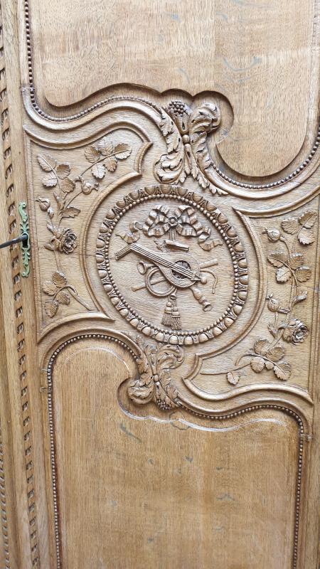 Very Beautiful Norman wedding wardrobe from Fécamp, early 19th century, oak, very good quality wardrobe with a large central bouquet; Note the two horns of plenty of fruits and flowers; Louis XVI ribbons, wheat sheaves.. agrarian instruments and musical instruments in the medallions of the doors, pretty low crossbeam also well worked, acanthus leaves on the key original feet; formerly used in wardrobe;similar armoire at The Fecamp Museum delivery; free of charge France; Belgium; London; Madrid; Florence; Switzerland 650, USA 1200 euros H 2m 55 - W 1m 44 - D 56 cm de profondeur - Inside deep 46 cm Cornice 1m 60 x 62 cm REFERENCE 4552 Verkoop en levering doorheen gans België van Normandische, eiken, kwaliteitsmeubelen. Bruidskasten, Bruidsbuffetkasten “Deux-Corps”.. Bonnetières ( Dit zijn 1 deurkasten met 1 of meerdere leggers en/of een lade) en Tafels.