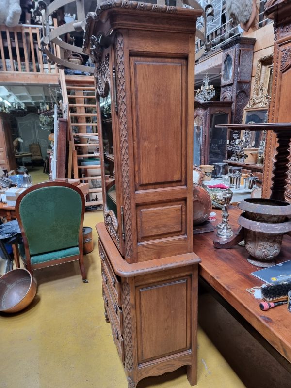 Small Norman bonnetière wedding chest of drawers, Norman craft furniture in pegged oak from the 1960s/1970s; lower part 3 drawers with sculpted fronts; flowered lower crosspiece; bevelled glazed upper part, carved with foliage; flowers; couple of birds at the top; the uprights are also carved? 3 adjustable shelves (with racks) key; good used condition Height 2m08 width 85 bottom depth 45 reference 5046 Worldwide shipping