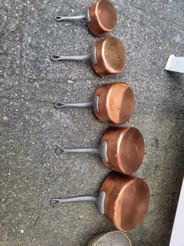 French set of 5 vintage copper pans