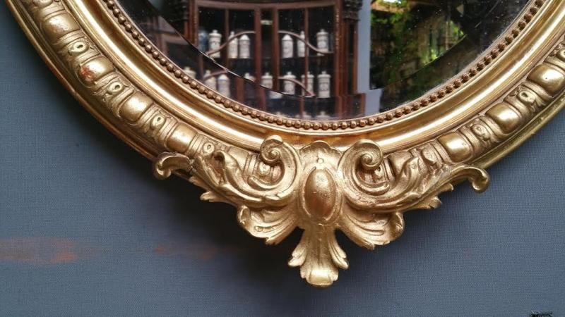 French golden oval mirror; good still good gilt,.mirror d origin beveled d origin with some small scratches acceptable