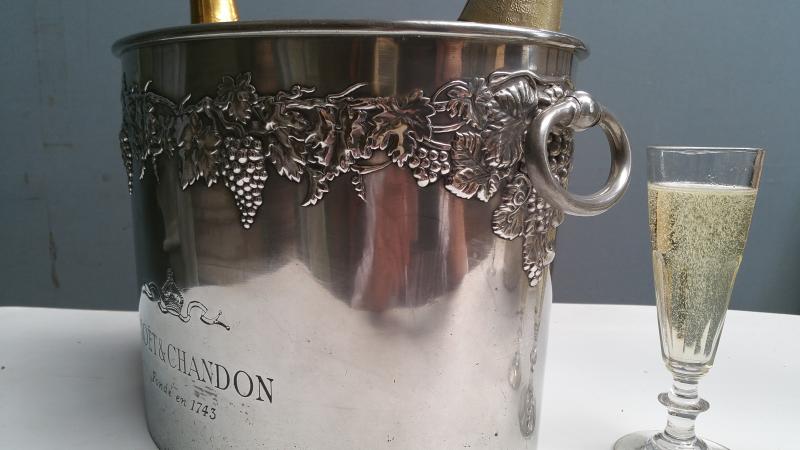 Big bowl with pewter champagne of restaurant or bar; celebrate mark(brand) of champagne; good old condition;for 2 /3 bottles L 13" - W 8" 1/2 - H 9" L 33 cm - W 22 cm - H 23 cm Item 3947