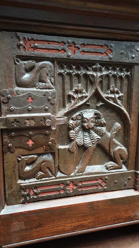 Gothic credenza, 2 leaves and 2 drawers, furniture in oak XIXeme with some elements 18th or 17 including the carved doors of Lions, good state of use Height 1m65 width 1m40 depth 57cm reference:4490
