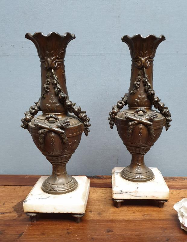 Pair of Louis XVI style lamps or vases bases, metal and marble; period 1880/1900: good condition 14" H - 4" 3/4 x 4" 1/2 base 36 cm H - 12 cm x 11 cm base référence 4906