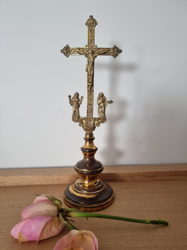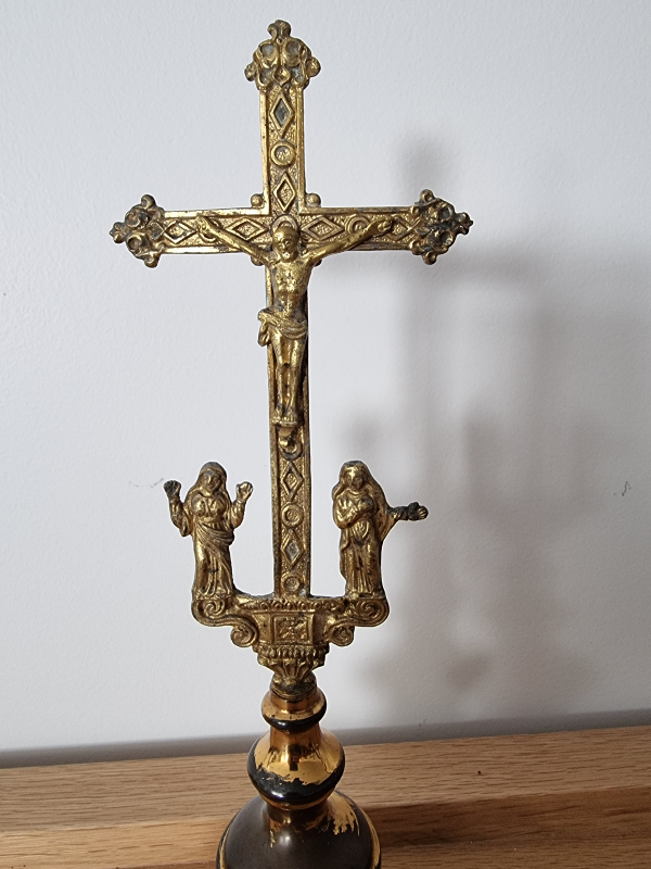 19th century Breton crucifix;Christ accompanied "by the Virgin and St Anne?; old condition Height 31xm 10 wide base 9,2cm of Diameter réference 4942